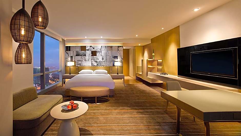 The spacious suite includes a living room and a bedroom, featuring impressive views of the city. Access to the executive lounge is provided.